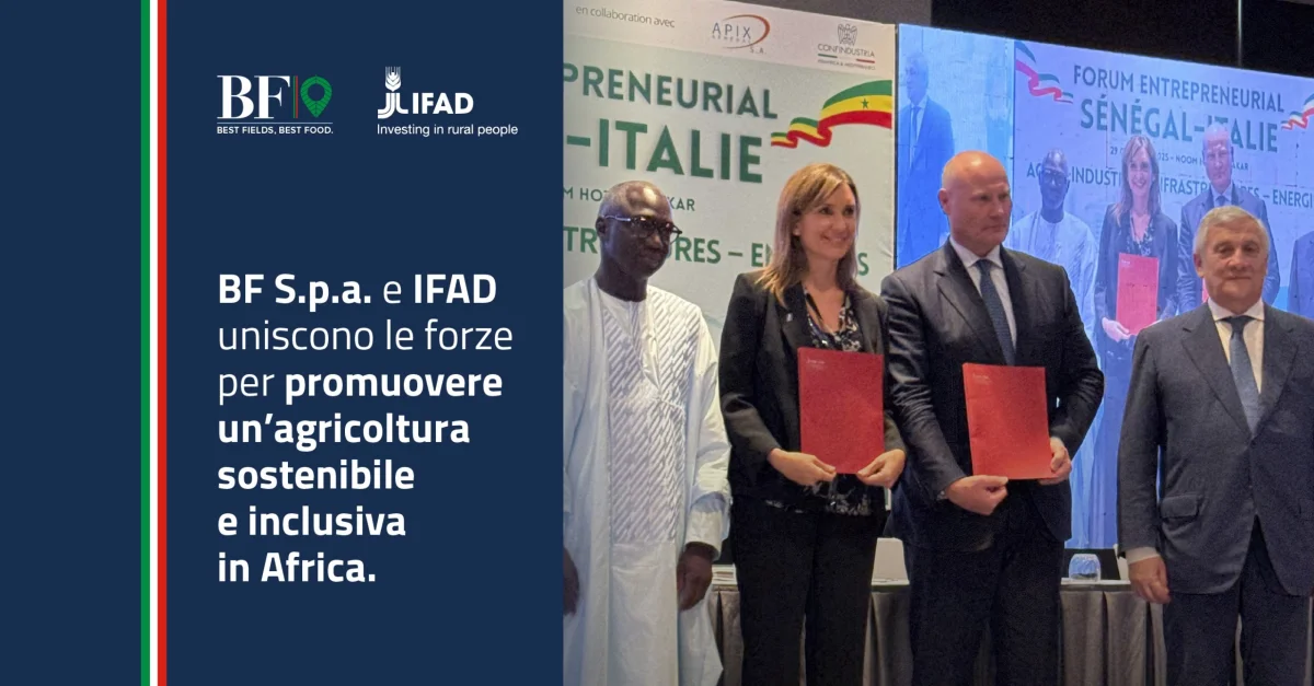 Il Fondo Internazionale per lo Sviluppo Agricolo (IFAD) delle Nazioni Unite e BF S.p.A, hanno firmato una Lettera di Intenti per esplorare opportunità di collaborazione volte a sostenere lo sviluppo agricolo sostenibile nei paesi in via di sviluppo, con particolare attenzione all’Africa.